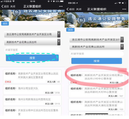 第六步,点击搜索,选择花果山派出所小村中心警务室;