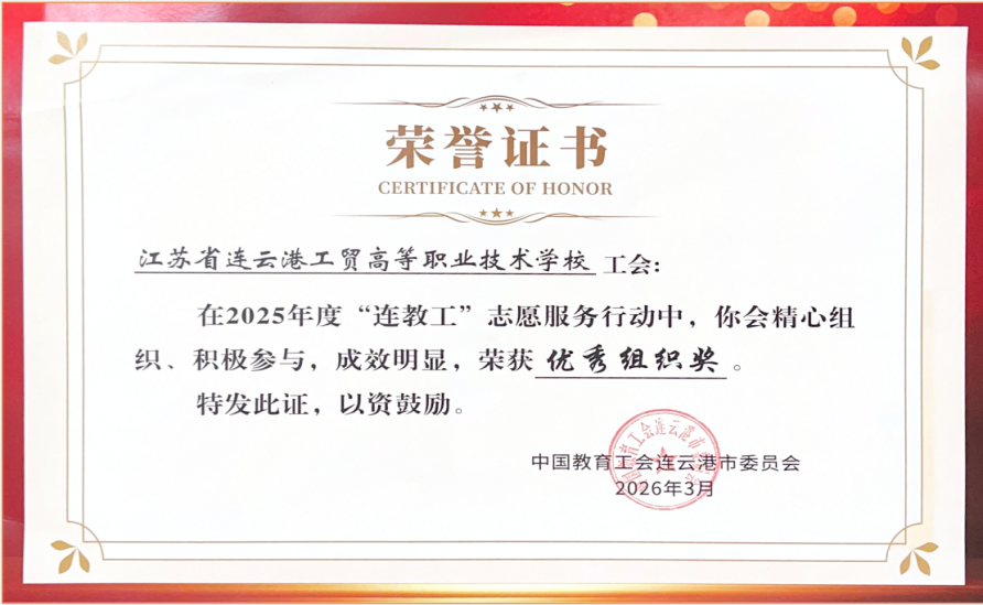 近日,我校荣获2025年度市教育工会“连教工”志愿服务“优秀组织奖”。这一荣誉是对学校充分发挥职业教育优势、精准对接社会需求、扎实开展志愿服务的充分肯定。