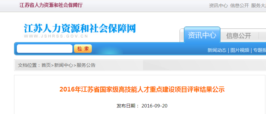 根据《关于做好2016年国家级高技能人才培训基地和国家技能大师工作室建设项目申报推荐工作的通知》(苏人社函〔2016〕316号)要求,省人社厅会同省财政厅组织专家,对各设区市推荐申报的高技能人才培训基地项目建设单位和技能大师工作室项目建设单位进行材料评审、现场考察,经研究,拟将南京技师学院、江苏省经贸技师学院等2家新申报单位列为我省2016年国家级高技能人才培训基地项目建设单位,江苏省盐城技师学院、江苏省常州技师学院、南京交通技师学院等3家老培训基地列为我省2016年国家级高技能人才培训基地项目继续支持单位;拟将刘进峰技能大师工作室(江苏省盐城技师学院)、韦冬技能大师工作室(江苏亨通光电股份有限公司)、田明技能大师工作室(中石化股份有限公司江苏油田分公司)、陆跃忠技能大师工作室(南京中电熊猫信息产业集团有限公司)、张宏文技能大师工作室(江苏国信协联能有限公司)列为我省2016年国家级技能大师工作室项目建设单位。现予以公示,公示期为3个工作日(2016年9月20日—9月22日),如有异议,请于公示期内向省人力资源和社会保障厅提出。