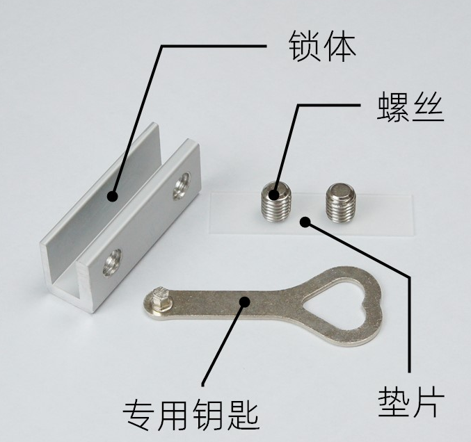 铝合金材质配不锈钢内六角螺丝和专用安装钥匙。 1.铝合金板材尺寸为长约6厘米、宽约1.45厘米、高约2.3厘米、内长约6厘米、内宽约7.5毫米、内高约1.9厘米、双螺丝孔、双孔间距约3.7厘米;数量6200个 2.专用安装钥匙厚约5.5毫米、数量若干,不少于20把; 3.内六角螺丝长约9.5毫米,数量12400个。 |