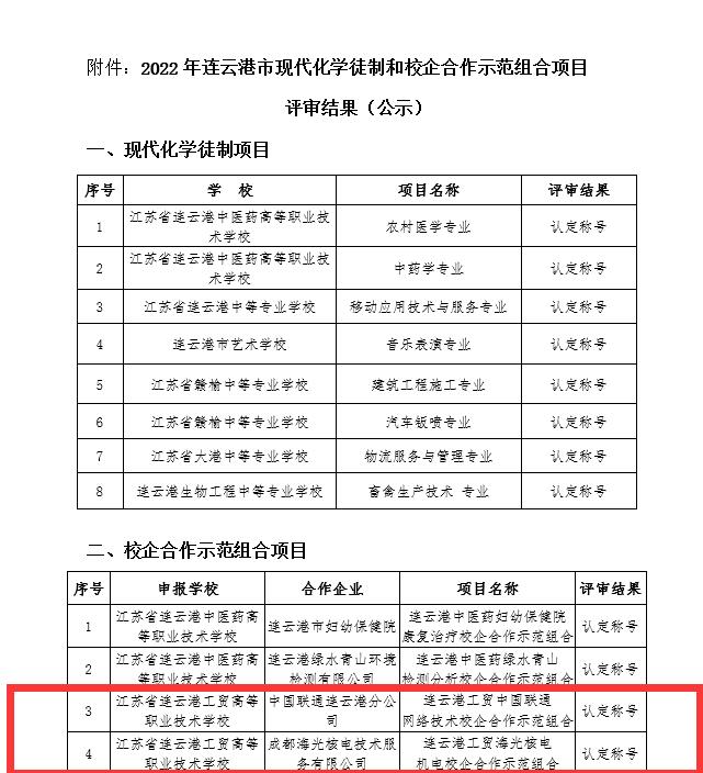 根据《关于组织开展2022年连云港市现代学徒制和校企合作示范组合项目认定工作的通知》,通过系部申报、学校审核并经市教育局组材料检查和现场视导,我校信息工程系与中国联通连云港分公司合作的网络技术校企合作示范组合、机电工程系与成都海光核电技术服务有限公司合作的机电校企合作示范组合两个项目获得市级认定称号。
