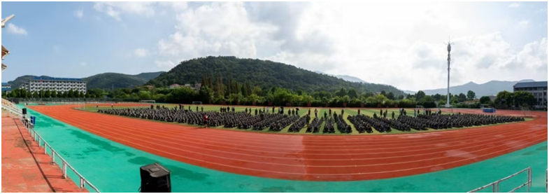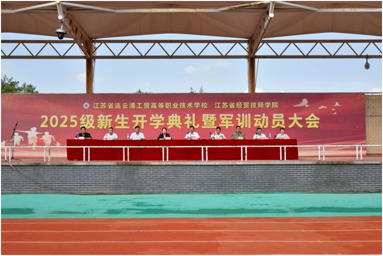 2025年9月9日上午,江苏省连云港工贸高等职业技术学校2025级新生开学典礼暨军训动员大会在操场隆重举行。校领导张国桥、潘迪、祁德新、杨健、董峻,花果山街道党工委书记王刚,花果山街道人民武装部部长李朝亮出席典礼。各系部书记、新生班主任及全体2025级新生参加典礼,学校党委委员、副校长杨健主持典礼。