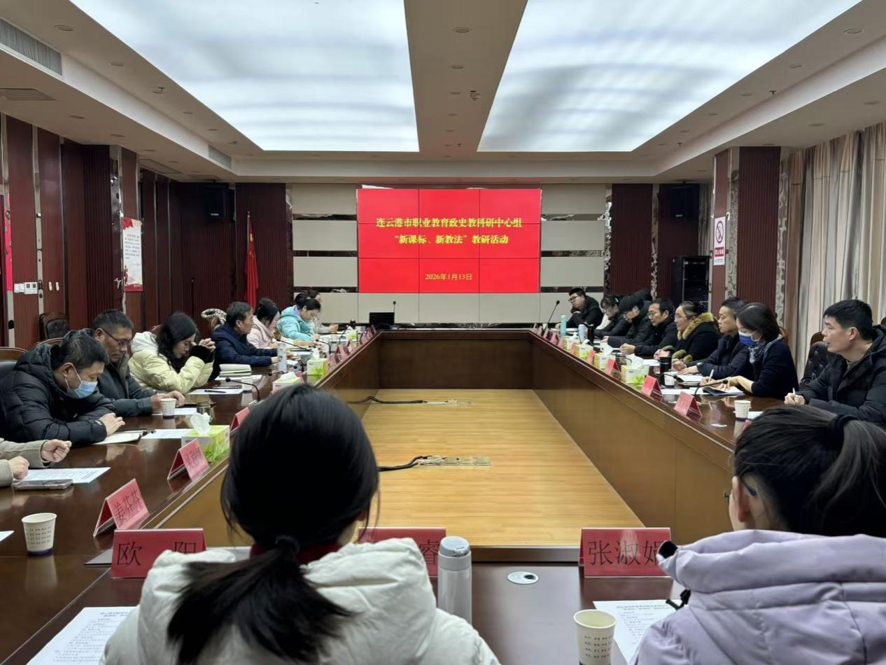 为深入推动职业教育思政与历史课程改革,精准落实新课标理念,探索课堂教学新方法,2026年1月13日,连云港市职业教育政史教科研中心组“新课标、新教法”教研活动在我校举行。学校党委委员、副校长杨健同志致欢迎辞。30余位市职教政史教科研中心组成员及骨干教师参加。