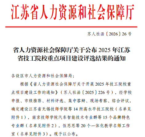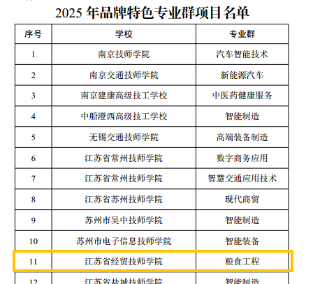 近日,江苏省人力资源和社会保障厅发布《关于公布2025年江苏省技工院校重点项目建设评选结果的通知》(苏人社函〔2026〕26号),我校粮食工程专业群成功入选2025年江苏省技工院校品牌特色专业群立项名单,这是我校在专业群建设与发展上取得的又一重要成果。