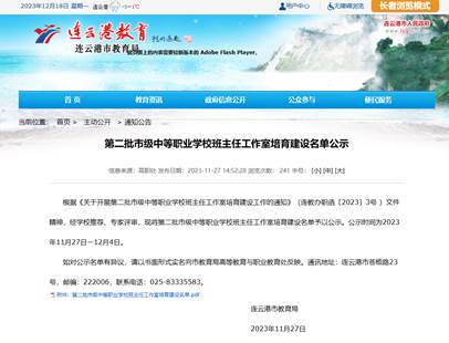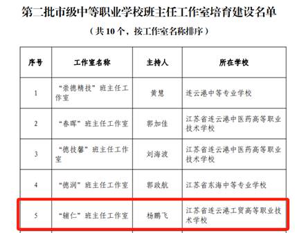 近日,连云港市教育局关于《第二批市级中等职业学校班主任工作室培育建设名单》公示,我校机电工程系杨鹏飞“辅仁”班主任工作室成功入选。