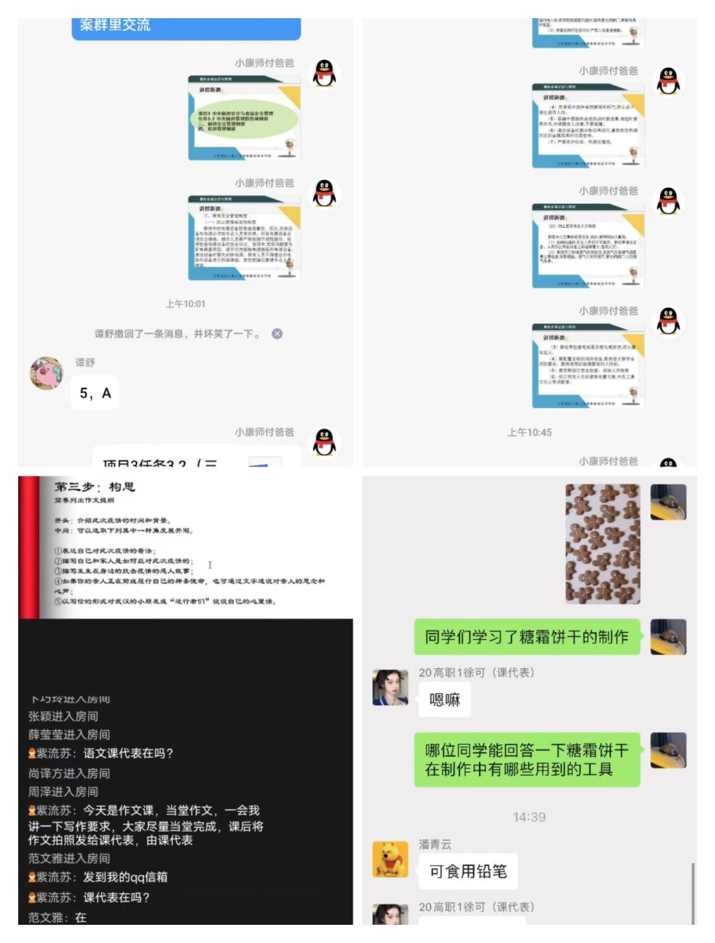 自连云港疫情爆发以来,粮油食品工艺系就在学校的领导下积极开展线上教学,教师利用QQ、微信、钉钉等软件认真开展线上教学活动,大家克服家庭琐事的干扰,认真完成教学任务,为疫情中的学生送去宝贵的知识。