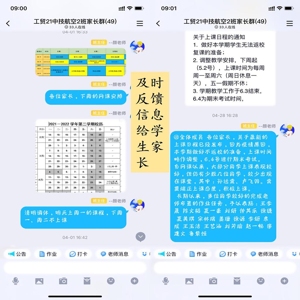 为保证教学进度和质量,“停课不停学”,班级根据学校教务处根据课程要求、作息安排表,指导学生和家长安排好在家的学习和生活。各任课教师协同合作,针对班级任课人数、作业完成情况、核酸检测与教学两手抓,保证线上教学工作井然有序、高效展开。建立“家庭-学校”联动的班级疫情防控管理,积极处理好与家长的沟通与反馈,居家隔离伊始,班主任就与所有同学家长进行电话沟通,交流学生日常表现,表扬优秀学生表现,并通过家长群及时传递权威信息,减缓学生与家长的焦虑情绪。