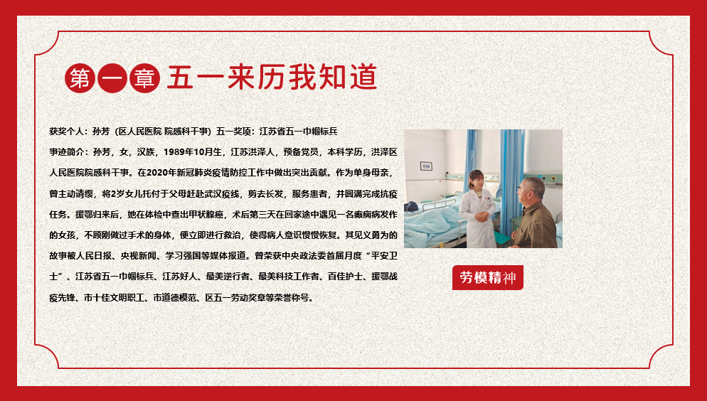 班会的第一部分是展示抗疫先锋们的英勇事迹,号召同学们学习劳模精神。孙芳,洪泽区人民医院院感科干事,在2020新冠疫情防控工作中做出突出贡献。作为一名单身母亲,她主动请缨,驰援武汉,托付女儿,照料病患,脱下慈母衣,换上天使白,圆满完成抗疫任务。其事迹多次被主流媒体报道,曾获中央政法委赋予的江苏省五一巾帼标兵,援鄂抗疫先锋等荣誉称号。孙芳的事迹充分的体现出“疫时代”下的爱岗敬业、艰苦奋斗、甘于奉献的劳模精神,值得同学们积极学习。