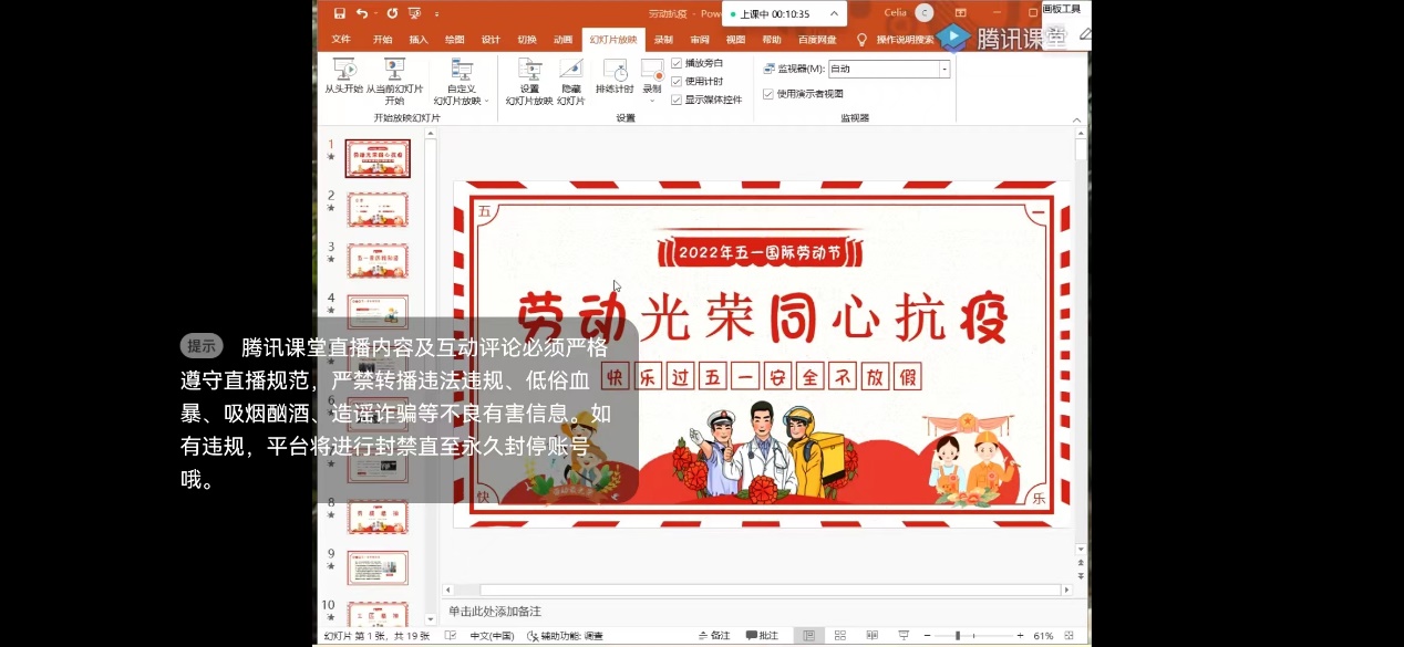 “人生在勤,不索何获?”随着时代的发展,五一的小长假使这个节日应发扬的“劳动”精神属性逐渐的被削弱,取而代之的是被贴上消费和旅行的标签。我们不禁思考,在学会享受生活的同时,是否也应让劳动教育成为学生成长的必修课?就此,21高职机电班展开了“劳动光荣 同心抗疫”的主题班会。