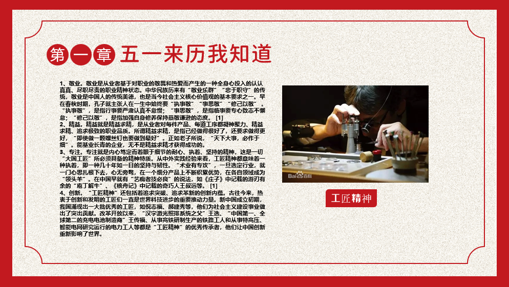 班会的第二部分是展示职业教育的发展,带领同学们研习工匠精神。作为职校生,学生们应始终将工匠精神铭记心中。习总书记指出:“在五一国际劳动节到来之际,我们更要深刻理解工匠精神的时代价值和重要意义,在逐梦、追梦、筑梦的新征程上,立足本职,爱岗敬业,大力弘扬践行工匠精神,真正做到致真、致诚、致用、致新、致善、致美、致勤、致劳。” 刘宏,首钢集团技术研究院、用户技术研究所焊工、国家级技能大师,在新钢种可焊性试验和新焊材的开发工作中做出杰出贡献。2015年,人社部批准“刘宏实验室”为国家级技能大师工作室。发动机焊接第一人高凤林,成品率100%的“御用画纸匠”周东红…他们身上所展现出的专注,严谨的将工作做到极致的细致,都是工匠精神最纯真的体现。我们不难发现:大国工匠,这群不平凡劳动者的成功既不是从名牌大学走出的,也不是从耀眼文凭中取得的,而是通过在平凡的岗位上精益求精,追求极致而收获的。如今,工匠精神已被写入政府工作报告,职校生们更应将精益求精,专注创新的行动要义铭记心中,在生活和学习中常怀一颗“匠心”。