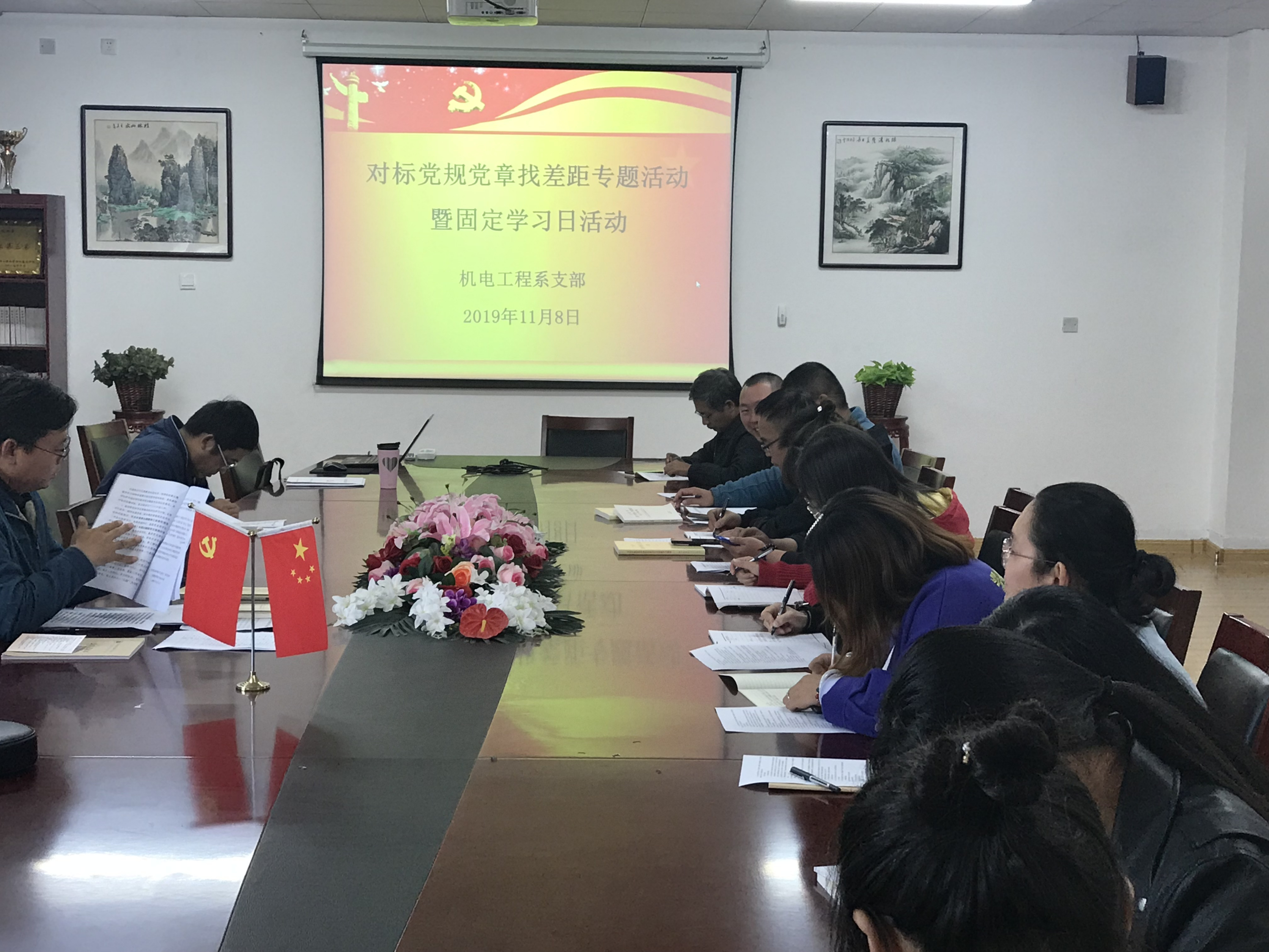 根据“不忘初心,牢记使命”主题教育领导小组要求和安排,2019年11月8日下午,机电工程系党支部在3号楼401会议室开展对标党规党章找差距专题活动暨固定学习日活动,会议由支部副书记薛主任主持,机电工程系全体党员参加。