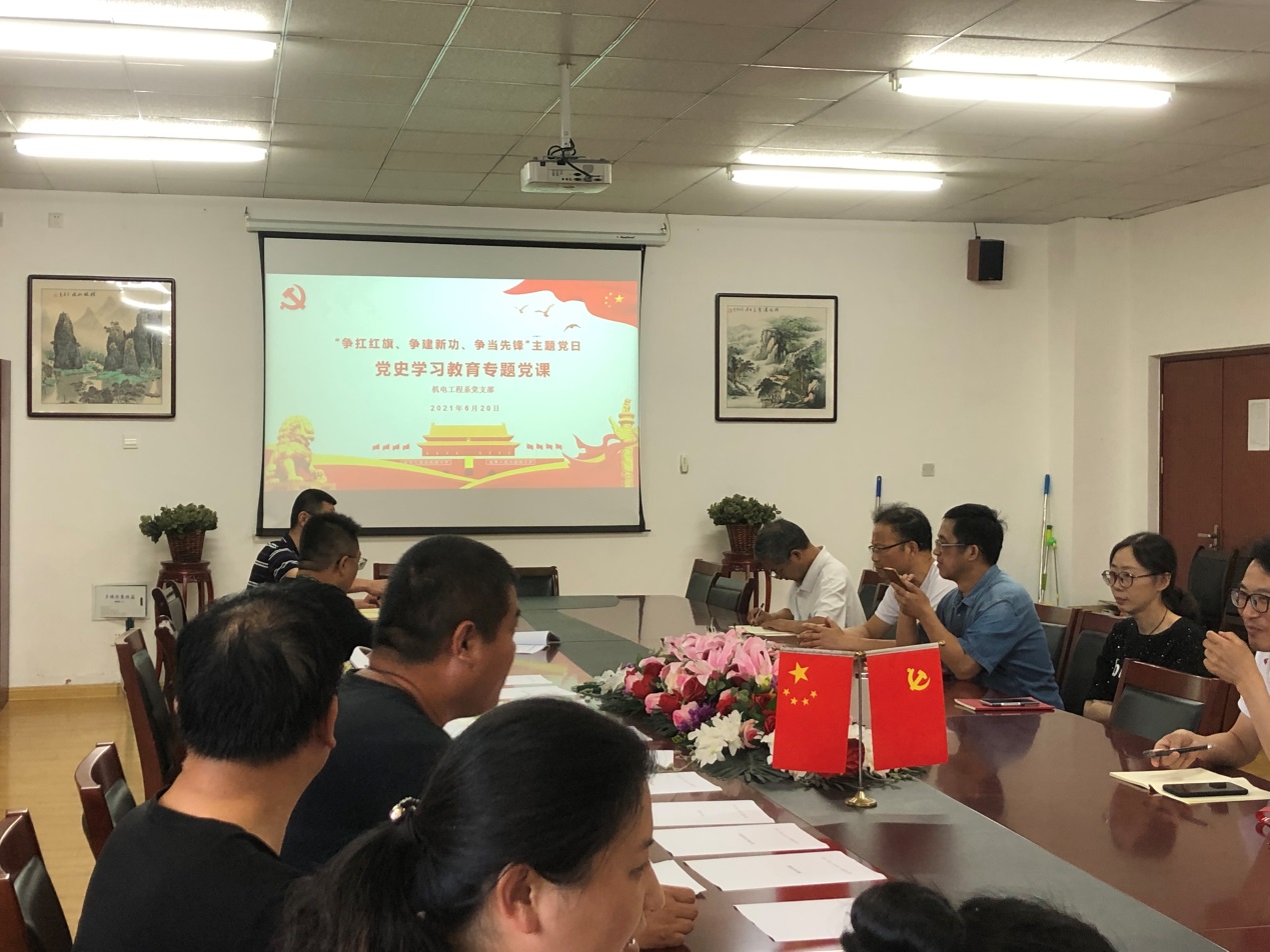 为深入落实党史学习教育要求,以昂扬向上的奋斗姿态迎接中国共产党成立 100 周年。机电工程系党支部于 6 月20日在支部党员中开展“争扛红旗、争建新功、争当先锋”主题党日活动,支部全体党员参加,支部书记主持。