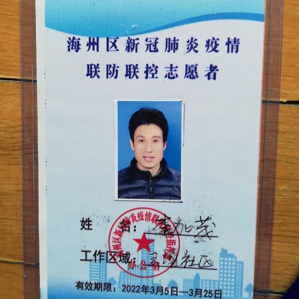 从早到晚,他一直坚守在社区卡口守护着居民的健康之门,维持秩序、疏导人员、测量体温、查验苏康码和行程码,帮老年人记录姓名手机号、进出时间及原因等等出入信息,并及时整理汇报。在换班后,李加茂老师又顾不上休息,挨家挨户普及疫情及安全知识,告诫居民佩戴好口罩,尽量减少外出,不集聚聊天,强调对于外地返连人员更要立即向社区、派出所等及时报备。
