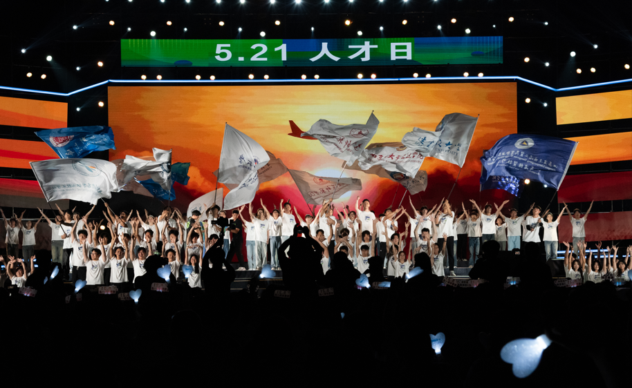 5·21人才日晚会上,校长潘迪为优秀毕业生代表颁发毕业纪念证书,勉励学子“以技能报效社会,用实干成就未来”。学校200名学生组成的方阵在拉歌环节倾情献唱,展现工贸学子坚韧拼搏的青春风貌。晚会尾声,学生与全场观众共同高歌《歌唱祖国》,用激昂旋律抒发爱国情怀,为活动画上圆满句号。