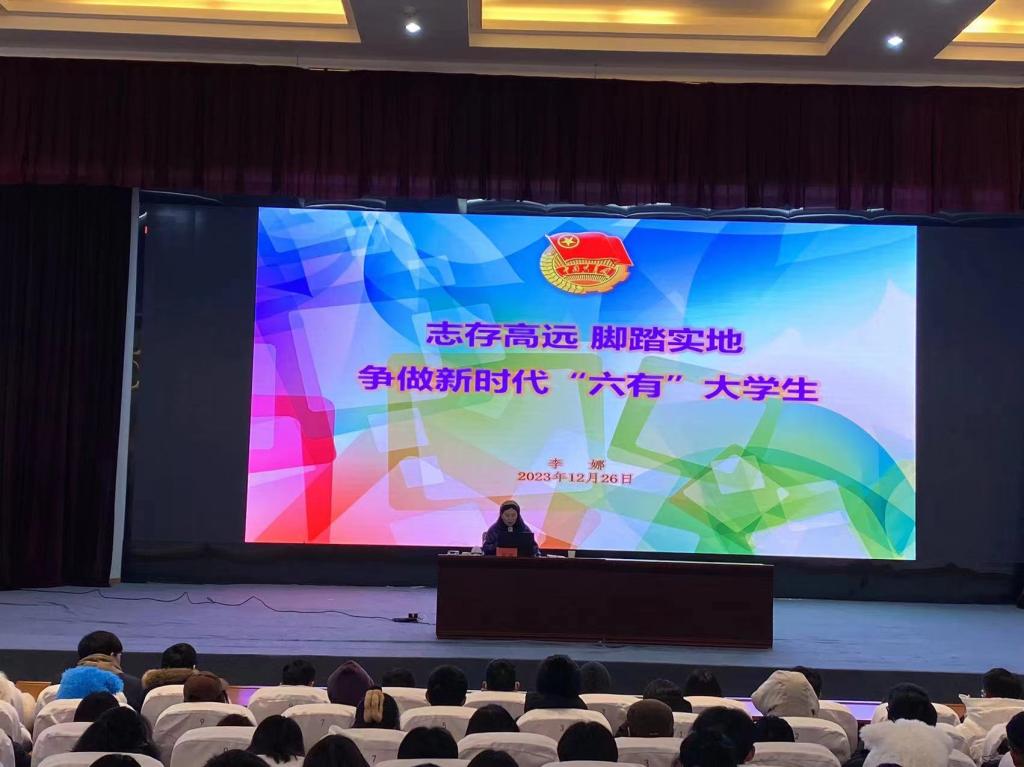 2023年12月26日,为深入学习领会习近平新时代中国特色社会主义思想,进一步引导学生筑牢信仰之基、补足精神之钙、把稳思想之舵,江苏省连云港工贸高等职业技术学校团委开展《争做新时代“六有大学生”》主题教育。主题教育在求真会堂水上报告厅举行,团市委学少部部长李娜同志为大家开展此次主题教育。
