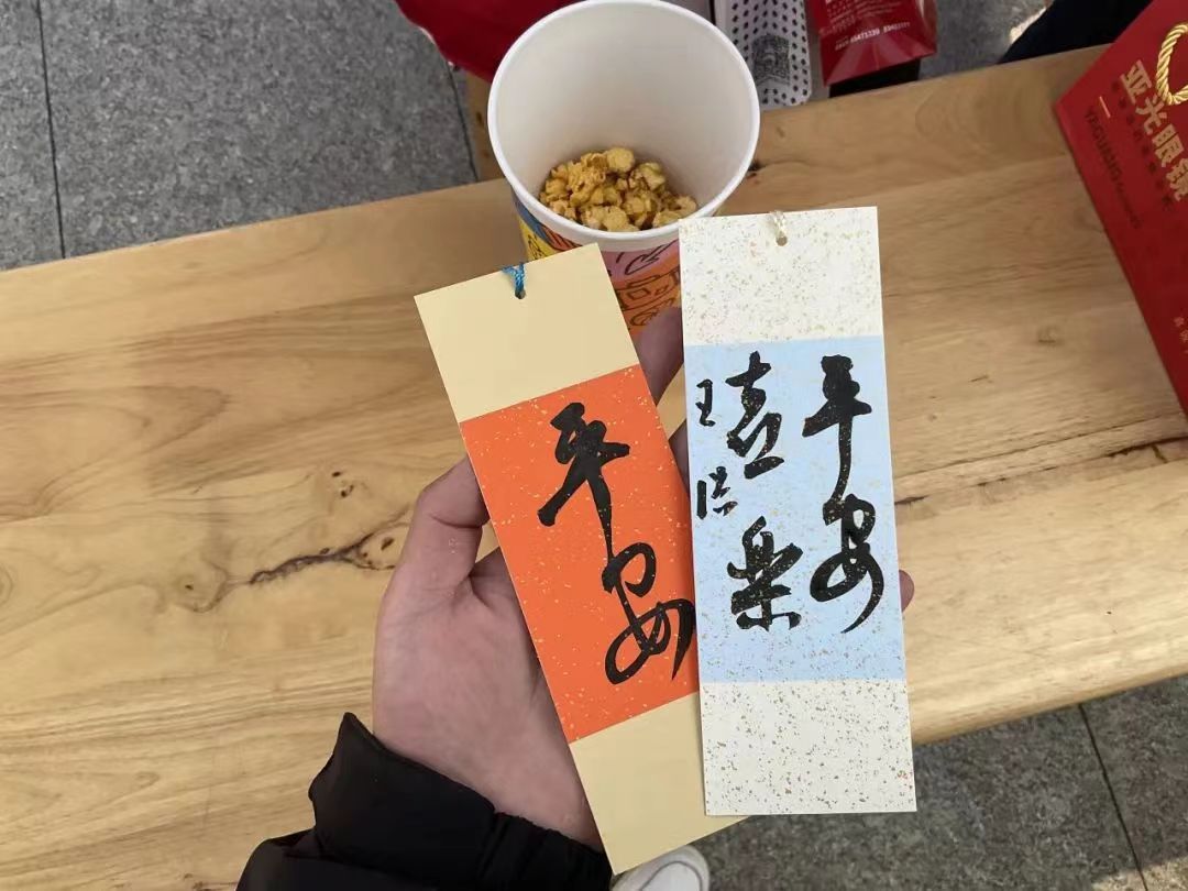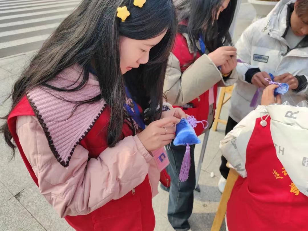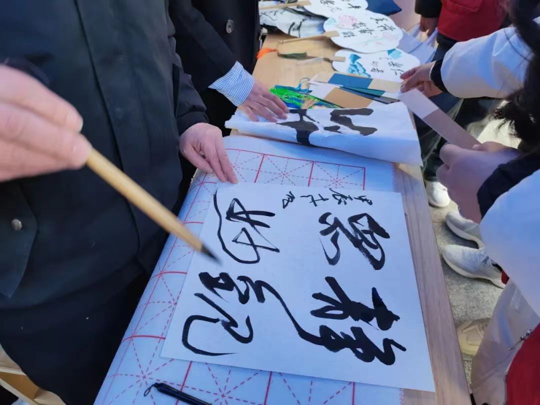 我校“初元”书画艺术分团的卜老师为同学们在卡片上题字祝福。“初见蓝韵”扎染艺术分团的宋老师为大家准备了精美的掐丝珐琅手工挂件。