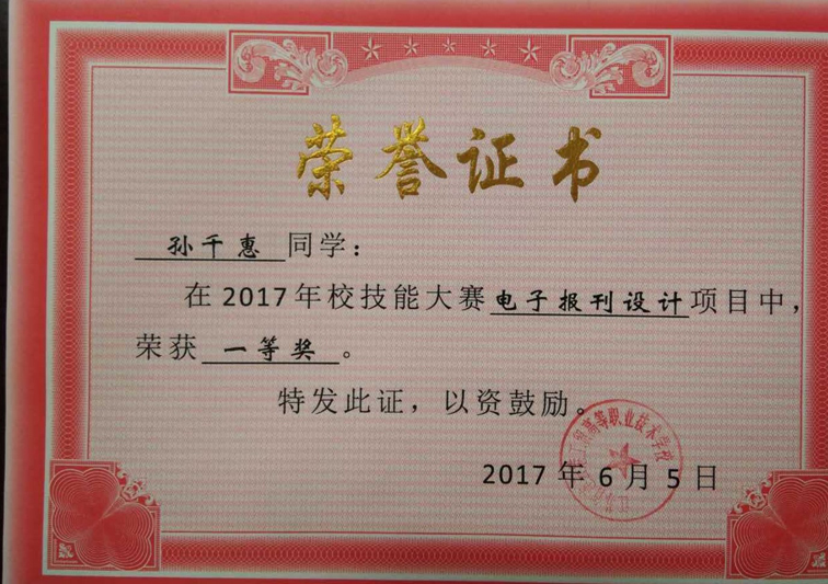 2016高职计算机2班,仅在电子报刊技能比赛中,共参赛9人,其中7人获奖,孙千惠获得电子报案一等奖。另在硬笔书法比赛中高燕获得该项一等奖。