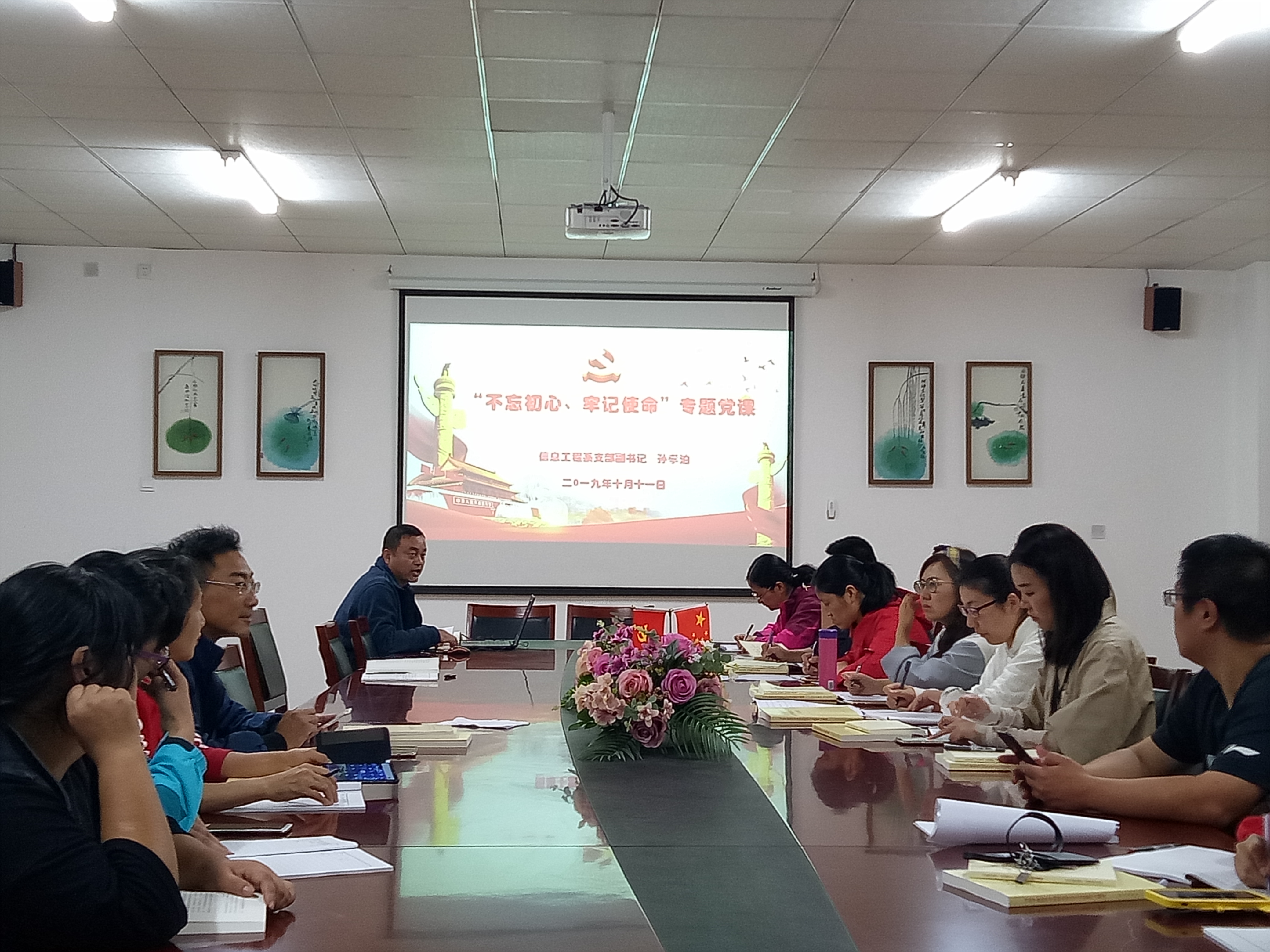 2019年10月11日,电子信息工程系开展“不忘初心、牢记使命”专题党课,由支部书记孙孝泊同志为大家讲党课。他从“不忘初心牢记使命”的重大意义、总体要求、目标任务、步骤方法四个方面详细讲解了党的初心和使命是什么、为什么要不忘初心牢记使命、如何才能不忘初心牢记使命、争做新时代的奋进者等内容。