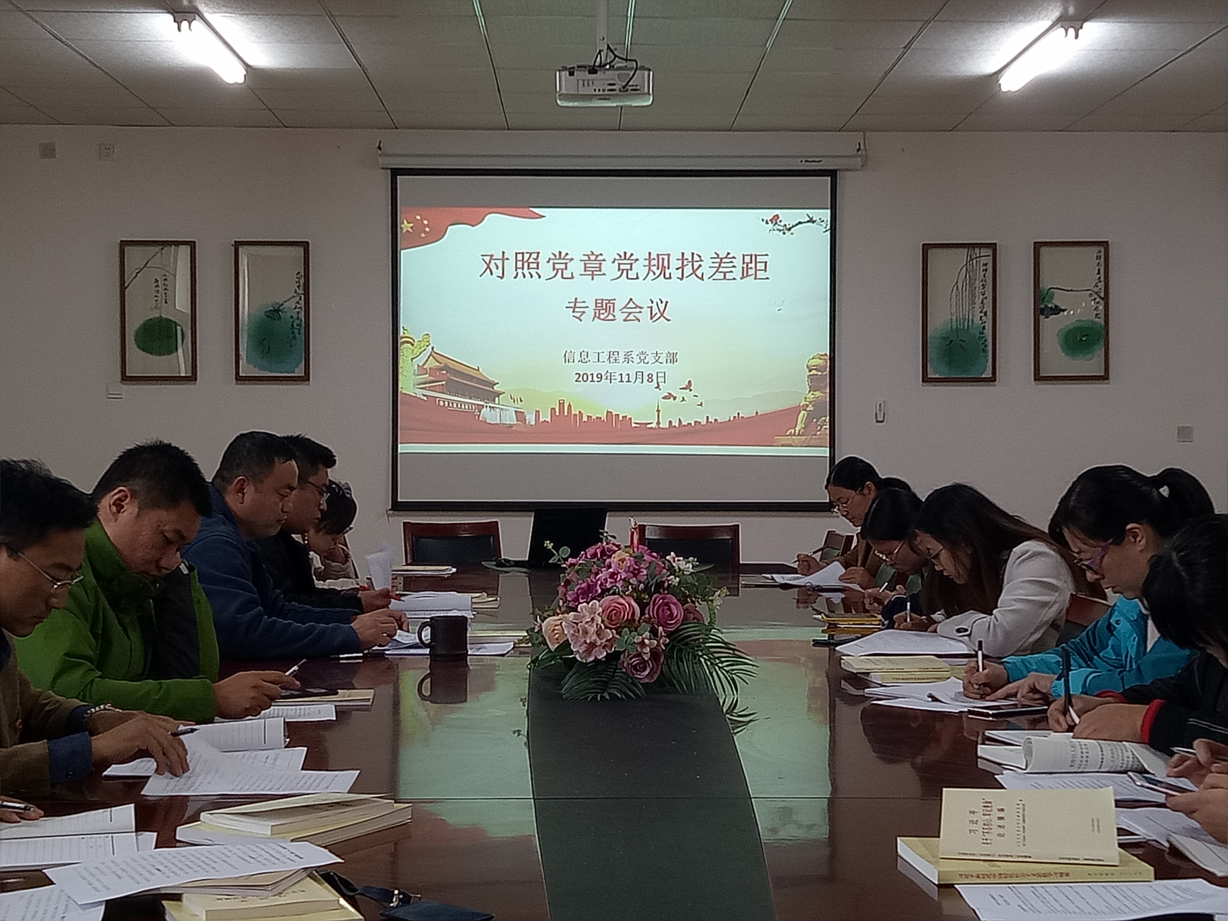 按照"不忘初心、牢记使命"主题教育活动安排,2019年11月8日下午,信息工程系党支部召开"对照党章党规找差距"专题会议,全体党员认真对照党章党规和聚焦"18个是否",查找不足,剖析存在问题,促进自我反思整改。